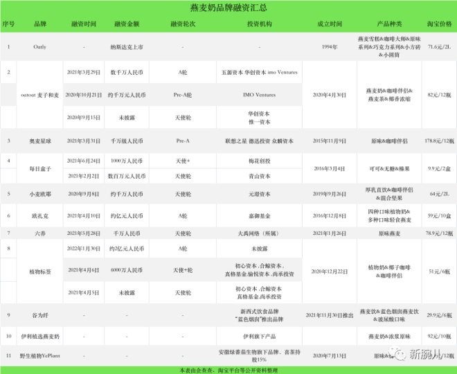 Oatly的上市,不出意外的引來一種跟風者。新腕依據(jù)公開資料,整理了10多家燕麥奶新品牌。有大品牌旗下產(chǎn)品,也有新銳品牌,梅花創(chuàng)投、青山資本、嘉御基金等知名機構(gòu)加入其中,希望自己可以押中下一個“Oatly”。