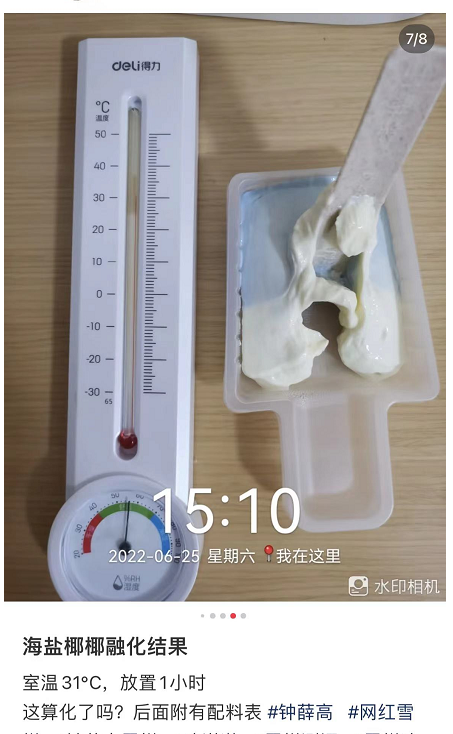 近日,鐘薛高再次登上熱搜,原因是被質(zhì)疑“31度高溫下不融化”。有網(wǎng)友發(fā)文稱,鐘薛高旗下一款海鹽口味的雪糕在31℃的室溫下放置近1小時后,仍然沒有完全融化。該話題引發(fā)熱烈討論,質(zhì)疑聲紛紛。
