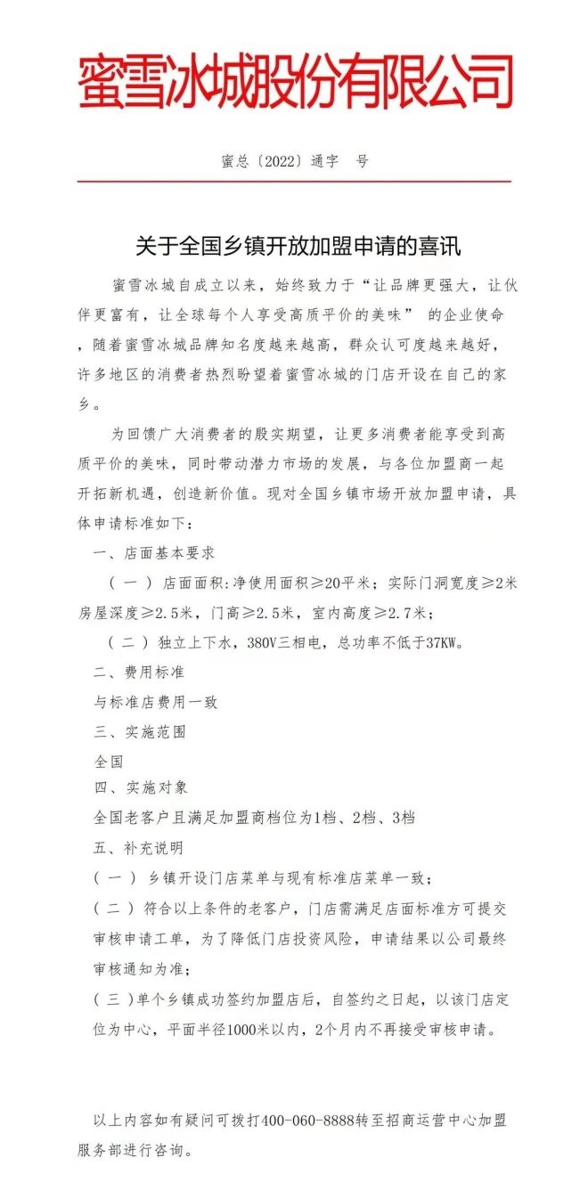 聯(lián)商快訊:近日,蜜雪冰城正式宣布開放全國鄉(xiāng)鎮(zhèn)加盟。