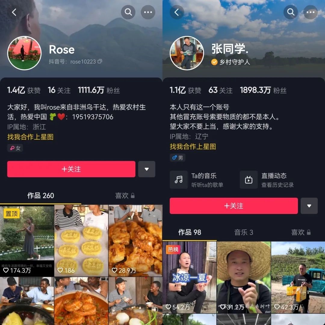 隨后,帥農(nóng)鳥哥席卷B站熱榜,被B站網(wǎng)友稱為“六邊形戰(zhàn)士版李子柒”,短短11天漲粉100萬。嫁到中國的非洲媳婦Rose,憑借拍攝制作各類中國鄉(xiāng)村美食,在抖音吸粉千萬,也被不少人稱作“非洲李子柒”。