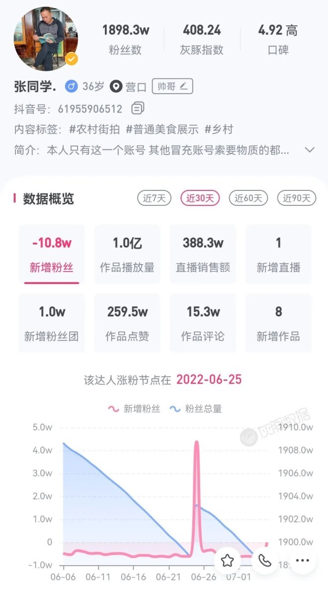 在不進即退的行業(yè)邏輯下,鄉(xiāng)村博主們逐漸遇到流量天花板。曾經(jīng)被認(rèn)為最有可能取代李子柒的張同學(xué),近期流量開始下滑,灰豚數(shù)據(jù)顯示,張同學(xué)近30天掉粉10.8萬,首場直播帶貨僅僅賣出了388萬元,對于擁有1800多萬粉的大主播而言,這個成績并不算好。