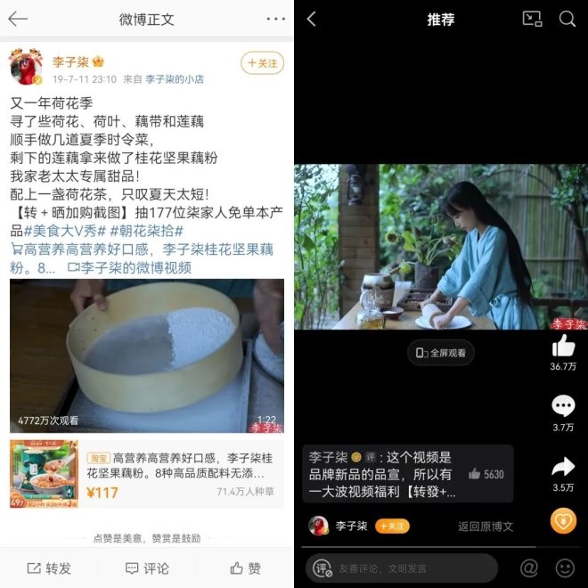 百聯(lián)咨詢創(chuàng)始人莊帥告訴「電商在線」,這樣的好處是李子柒可以專注于保持內(nèi)容的純正性,“李子柒的品牌基本都是微念在運營,這樣的好處就是她專注做內(nèi)容,繼續(xù)拍攝各種詩意的鄉(xiāng)野生活,不用思考貨需要怎么去賣,怎么運營品牌,也不用像一些主播去思考怎么講直播話術(shù),怎么布置直播間,同時也不會破壞她之前打造的固有形象!