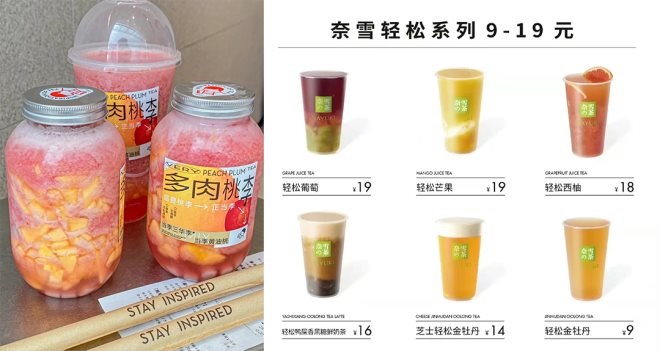 同樣的事情也發(fā)生在奈雪身上,在奈雪此前公布的降價(jià)函中,大部分產(chǎn)品調(diào)整5-10元不等,曾經(jīng)30元一杯的霸氣葡萄、霸氣芒果,如今只有19元。整體產(chǎn)品價(jià)格帶下移,目前已無30元以上單品,14-25元成為其主力價(jià)格區(qū)間。