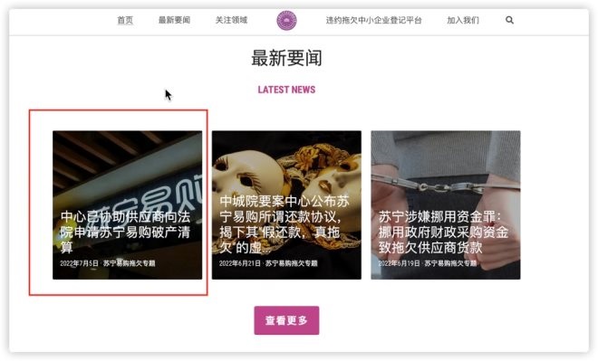 據(jù)了解,“供應(yīng)商向法院申請(qǐng)?zhí)K寧易購破產(chǎn)清算”的消息,來源于一家名為“中城院要案中心”的法律服務(wù)機(jī)構(gòu)的官網(wǎng)。