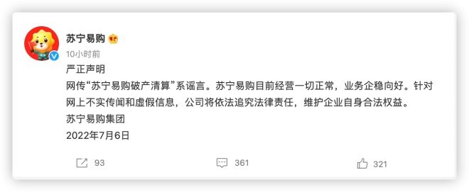蘇寧易購回應(yīng)破產(chǎn)清算:系謠言