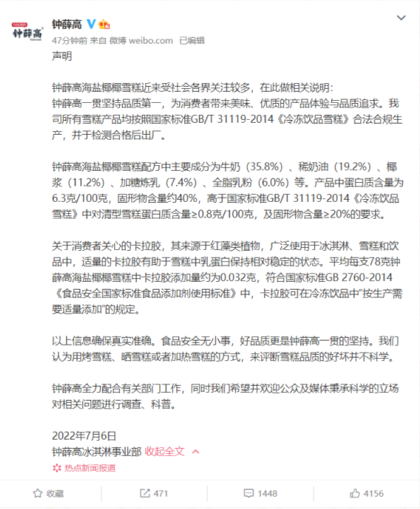 與此同時(shí),鐘薛高承諾將全力配合有關(guān)部門工作,同時(shí)希望并歡迎公眾及媒體秉承科學(xué)的立場(chǎng)對(duì)相關(guān)問(wèn)題進(jìn)行調(diào)查、科普。