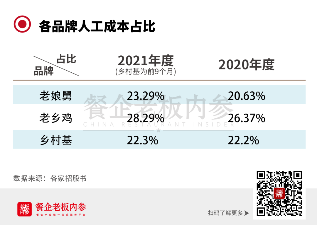 對比三家“中式快餐”大佬可見,老娘舅、鄉(xiāng)村基人工成本占比較為平穩(wěn),其中老娘舅2021年度占比23.29%,2020年度占比20.63%;鄉(xiāng)村基也穩(wěn)定在22%左右;相比之下,老鄉(xiāng)雞由于擴(kuò)張及人才儲備需求,人工成本占比更大,分別為28.29%和26.37%。