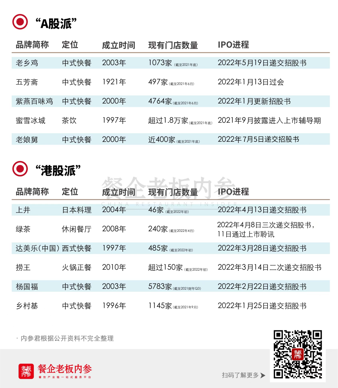 在此之前,內(nèi)參君曾盤點過截至2022年5月國內(nèi)遞交招股書的餐飲企業(yè),具體如下圖: