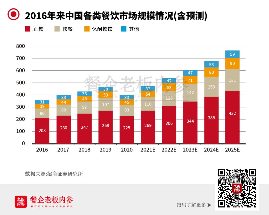 根據(jù)招商證券報告顯示,2016年至2019年,我國快餐行業(yè)的市場規(guī)模復(fù)合增長率達(dá)到了10.4%,預(yù)計2025年,快餐行業(yè)市場規(guī)模將達(dá)到1.8萬億。