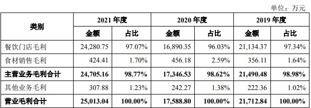從毛利分析可見,老娘舅餐飲門店毛利2021年為2.43億元,占比97.07%,食材銷售毛利占比1.7%,其它業(yè)務(wù)毛利占比1.23%。而且,對比2019年度和2020年度,這個毛利結(jié)構(gòu)并沒有太大變化,均超過96%。