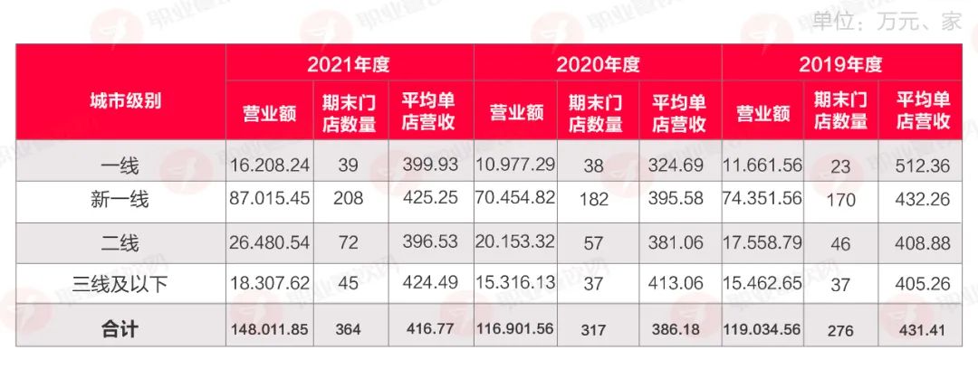 而在營收上,新一線城市基本占據(jù)了主要收入,新一線2021年年度營業(yè)額在8.7億元,平均單店年營收在425萬。