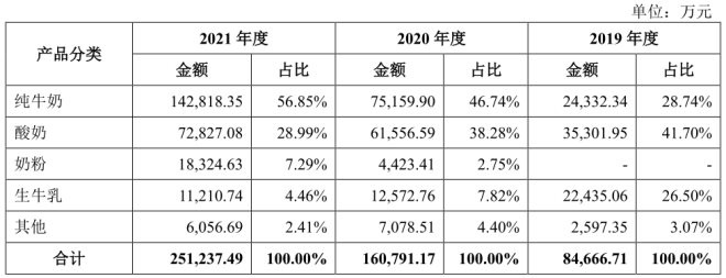 圍繞常溫奶,認(rèn)養(yǎng)一頭牛接連推出純牛奶、酸奶、奶粉等乳制品以及生牛乳。2019年,乳制品的銷售收入為8.47億元,2020年達(dá)到16.1億元,翻了將近一倍。到2021年,乳制品帶來的收入超過25億元。