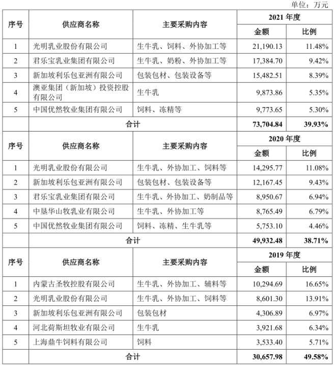 其中光明乳業(yè)、君樂寶兩家乳企,不僅是前五大外協(xié)廠商,同時也是認(rèn)養(yǎng)一頭牛的供應(yīng)商,為其提供生牛乳、奶制品、飼料等,且認(rèn)養(yǎng)一頭牛對其采購金額在逐年提升。