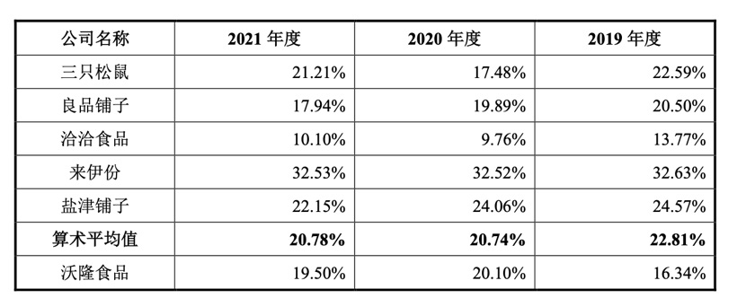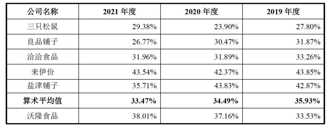不過(guò)在整體毛利率上,沃隆食品近兩年來(lái)高出同行。招股書(shū)顯示,2019年—2021年,沃隆食品毛利率分別為33.53%、37.16%、38.01%,連年上升,同期行業(yè)平均毛利率分別為35.93%、34.49%、33.47%。