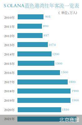 14年間,藍(lán)港有過高光時(shí)刻,但也有不如意的時(shí)刻。北京商報(bào)記者拿到了一份藍(lán)港提供的項(xiàng)目介紹,單從客流來看,2011年客流量從前一年的905萬人減少到890萬,流失了15萬人,2012年客流量略微回升7萬人至897萬人。2013年藍(lán)港客流量上升到1074萬人,2014-2017年算得上是藍(lán)港客流的好時(shí)光:彼時(shí)年客流從1200萬人提升至1800萬人,平均年增長客流達(dá)150萬人。