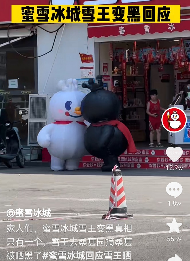 舉個(gè)栗子,在河南連續(xù)經(jīng)歷高溫天氣后,#雪王黑化#的話題沖上熱搜,后來(lái)他們推送一條揭秘視頻,真相是雪王去摘桑葚果被曬黑,暗示要上新桑葚新品。