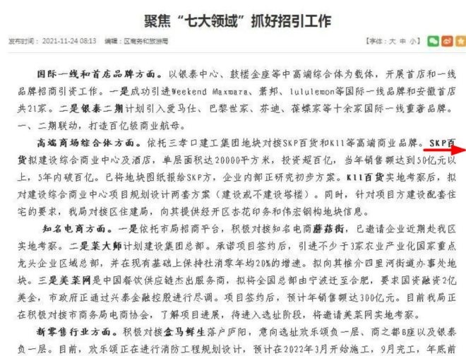2021年11月,在廬陽區(qū)商務和旅游局發(fā)布的“聚焦‘七大領(lǐng)域’抓好招引工作”消息中提及,將依托三孝口建工集團地塊對接SKP百貨和K11等高端商業(yè)品牌。且消息更明確了彼時已經(jīng)將地塊圖紙報給SKP方,企業(yè)內(nèi)部正研究初步方案,項目計劃打造綜合商業(yè)中心及酒店,單層面積達2萬方,投資超百億。