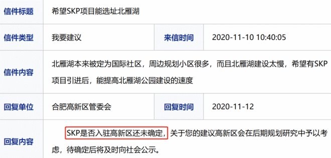 不過隨后,合肥高新區(qū)管委會否認了該消息,并稱SKP是否入駐高新區(qū)還未確定。此后,并無高新區(qū)引入SKP的消息。