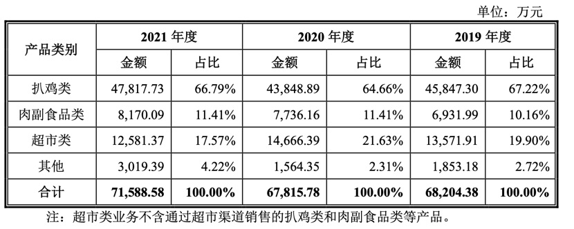 德州扒雞的收入主要來自扒雞類產(chǎn)品。具體來看,2019年—2021年來自扒雞類產(chǎn)品的收入分別為4.58億元、4.38億元和4.78億元,占主營(yíng)業(yè)務(wù)收入的比例分別為67.22%、64.66%和66.79%。