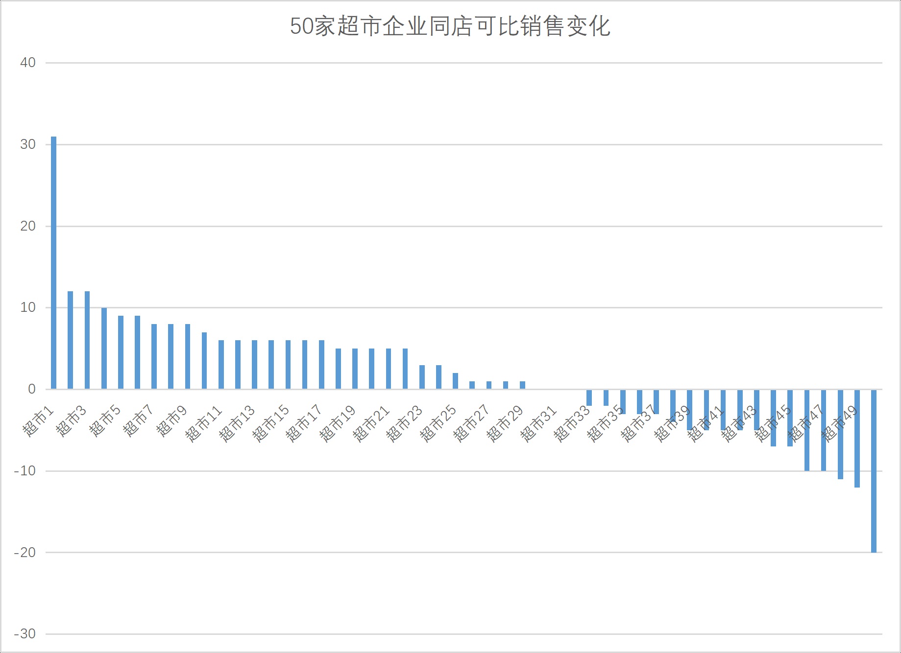 從同店可比銷(xiāo)售指標(biāo)看,此次統(tǒng)計(jì)中,有29家超市企業(yè)可比銷(xiāo)售實(shí)現(xiàn)增長(zhǎng);3家超市企業(yè)同店可比銷(xiāo)售與去年同期持平;18家超市企業(yè)出現(xiàn)下降。整體來(lái)看,同店可比銷(xiāo)售增長(zhǎng)平均幅度超過(guò)下降幅度。