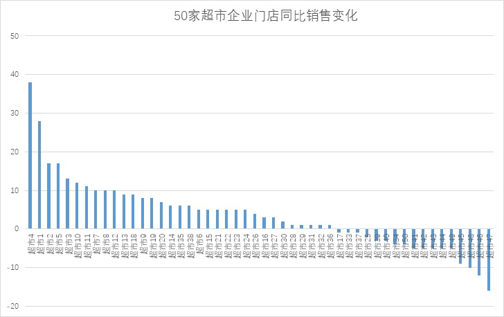 從門(mén)店銷(xiāo)售同比指標(biāo)看,有33家超市企業(yè)的門(mén)店銷(xiāo)售相比去年同期實(shí)現(xiàn)增長(zhǎng);17家超市企業(yè)出現(xiàn)下降。