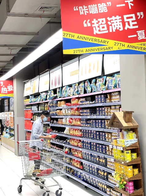 最近,在上海家樂福古北店,一道道帶有“27th Anniversary”標(biāo)志的吊板,亮眼醒目,上面詼諧趣味的文字,吸引了不少消費(fèi)者駐足細(xì)讀!胺攀罴倭藥∨笥褋砉涑,他看到這個(gè)很起勁”,消費(fèi)者李女士表示,“文字內(nèi)容都很有生活氣息,蠻有意思,是逛超市的氛圍”。