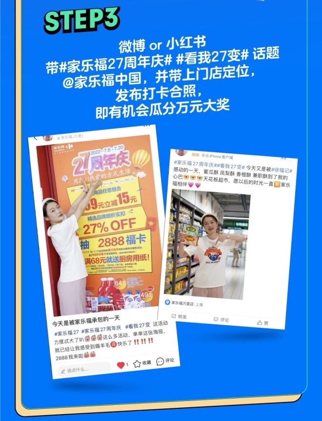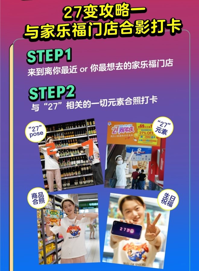 同時(shí),7月9日至7月20日期間,在家樂福門店拍攝帶有“27”元素的照片、視頻打卡,即可參與家樂福周年慶“看我27變”線上慶生特別活動(dòng)?梢耘c任意“27”元素合影,可以挑選心儀的商品配合拍照,也可以在商品的配合下擺出“27”的造型,更可以為家樂福27周年慶送上生日祝!臄z照片、視頻,在微博或小紅書平臺(tái)帶#家樂福27周年慶##看我27變#兩個(gè)指定話題發(fā)布,@家樂福中國并帶上門店定位,即可參與。