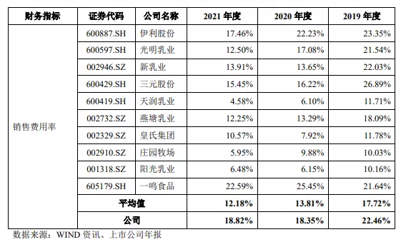 認養(yǎng)一頭牛在營銷上的投入一直在大幅增加,2019年至2021年分別投入近2億、3億、近5億,對應的銷售費用率分別為18.82%、18.35%和22.46%,長期高于行業(yè)平均水平。這些費用基本上都花在了線上渠道的營銷推廣,認養(yǎng)一頭牛在招股書中解釋,線上營銷的邊際成本增加造成了營銷支出的提高。