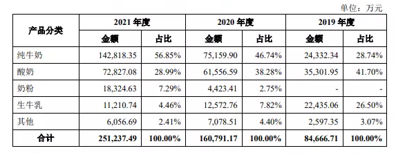 財報顯示,整個2021年純牛奶、酸牛奶、奶粉和生牛乳的銷售額分別為9.8億、5.45億、1.28億和0.84億,占比分別為54.84%、30.49%、7.17%和4.69%。