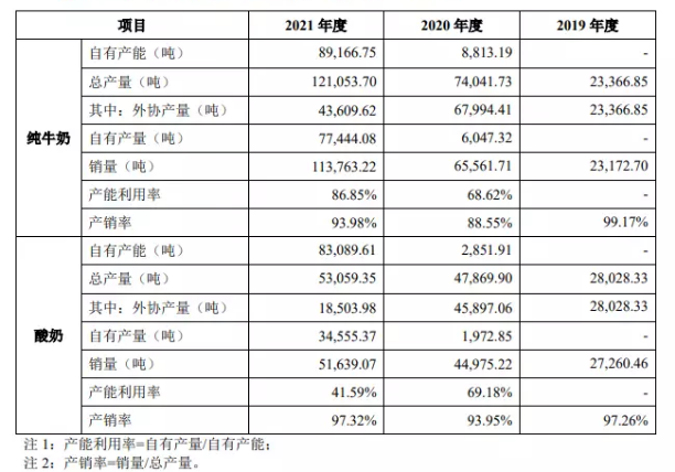 根據(jù)招股書,在純牛奶等成品生產(chǎn)模式方面,公司主要采取自主生產(chǎn)與外協(xié)加工相結合的生產(chǎn)模式。2021年純牛奶自有產(chǎn)量和外協(xié)產(chǎn)量的占比分別為64%、36%,酸奶則是65%、35%。對此,認養(yǎng)一頭牛表示,受到前期牧場及產(chǎn)能建設等因素影響,公司2020年起持續(xù)增加自有產(chǎn)能投入,隨著自有工廠建成投產(chǎn), 到2021年,自有產(chǎn)能才有明顯提高。