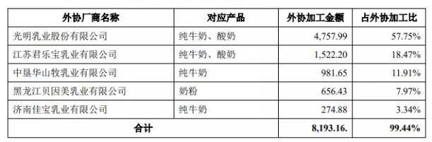 其中,光明乳業(yè)、君樂寶、貝因美等,為認養(yǎng)一頭牛的前五大外協(xié)廠商成員,幫其加工純牛奶、酸奶、奶粉等。