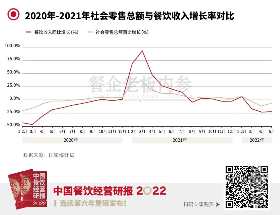 其次是行業(yè)放緩。以往整個行業(yè)動輒10%、甚至20%的年增長已成為遙遠的記憶,整個社會消費品零售總額同比增速,從2021年3月份的34.2%持續(xù)下降。而最新數(shù)據(jù)顯示,今年前5個月,社會消費品零售總額下降1.5%,餐飲的數(shù)據(jù)更是慘不忍睹。
