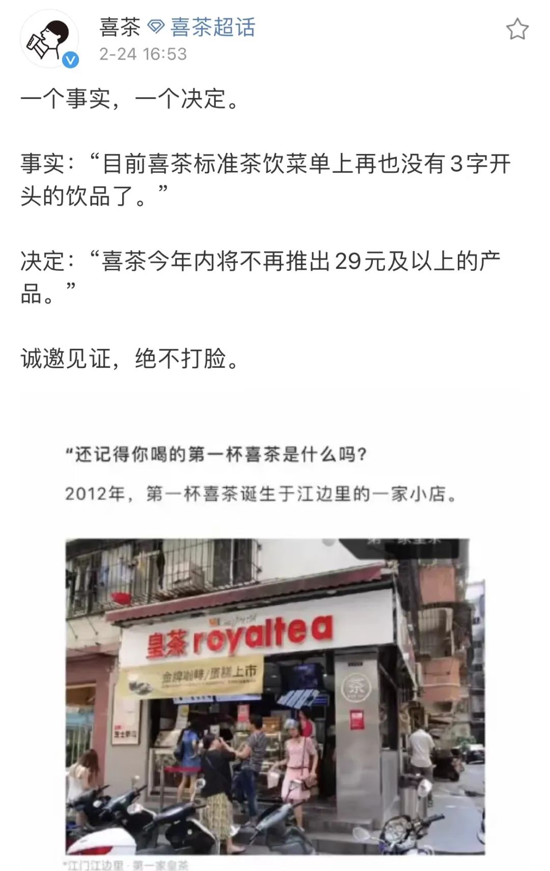 今年2月24日,喜茶在其官方微博上宣布降價,表示今年內(nèi)將不再推出29元及以上的產(chǎn)品。甚至放下了“誠邀見證、絕不打臉”的狠話。