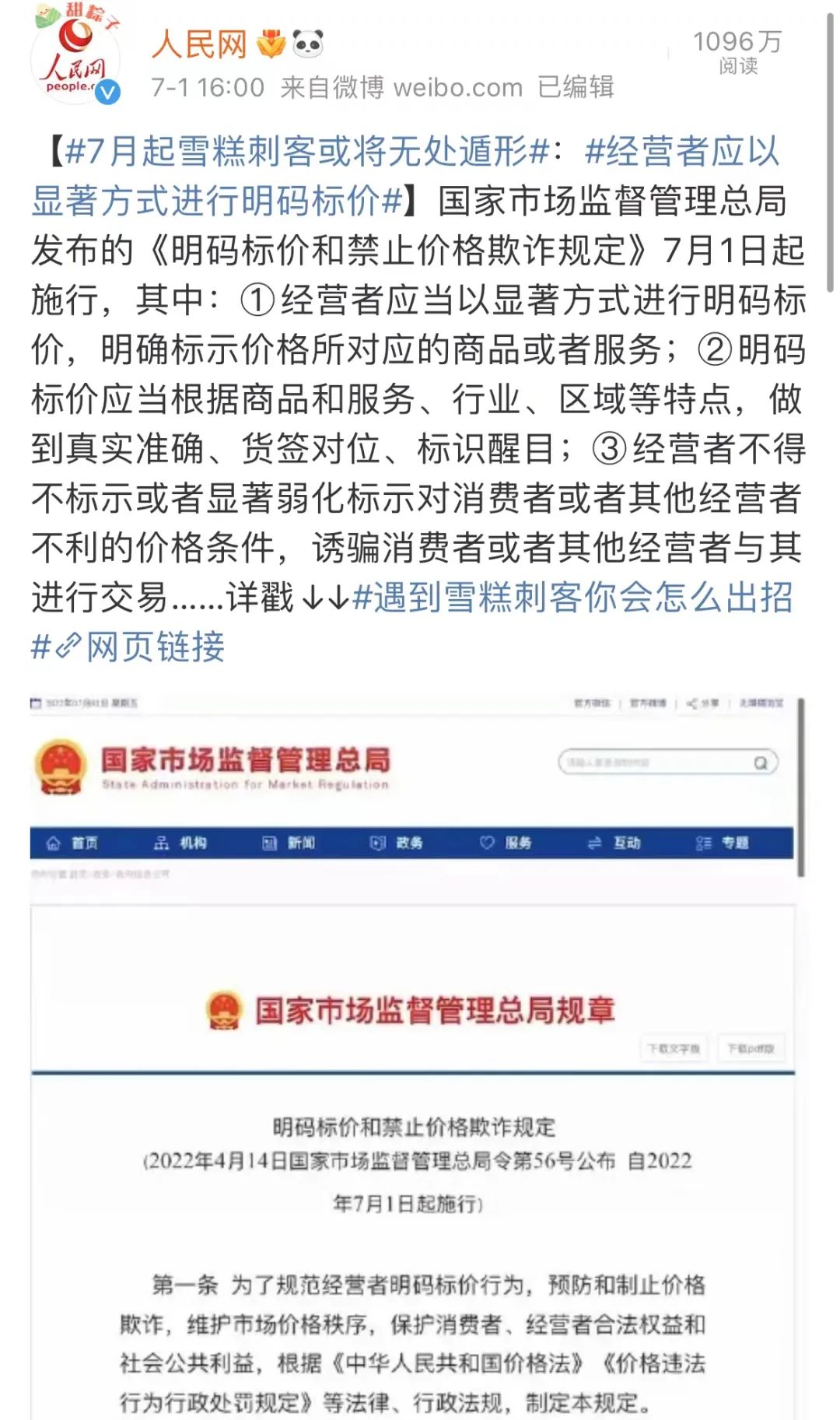 人民網(wǎng)官博在該話題下發(fā)表消息稱,國家市場監(jiān)督管理總局發(fā)布的《明碼標價和禁止價格欺詐規(guī)定》將在7月1日起施行,經(jīng)營者應(yīng)以顯著方式進行明碼標價。