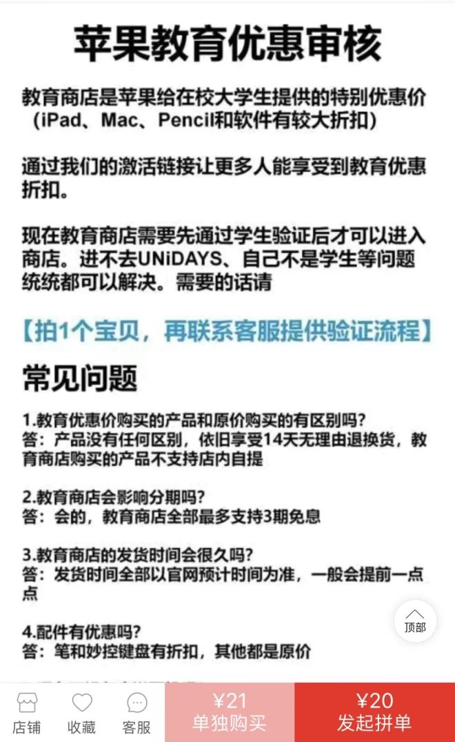 如今,這個面向特定群體的優(yōu)惠政策,在現(xiàn)實中卻有著一條完整的灰色產(chǎn)業(yè)鏈。只要在拼多多上花費幾元或者幾十元,就可以輕松繞過蘋果公司煩瑣的資格認證手續(xù),獲得折扣價格。