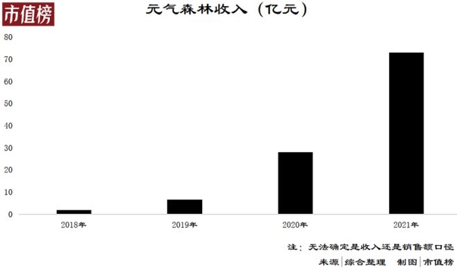 根據(jù)相關(guān)報(bào)道,2020年和2021年,元?dú)馍值氖杖敕謩e增長(zhǎng)了3倍和1.6倍,2021年收入73億元(一說(shuō),銷售額,也有報(bào)道稱70億元)。