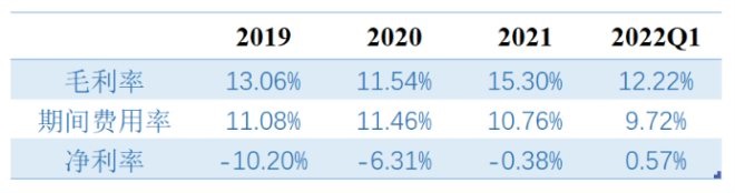 2019-2022Q1國(guó)聯(lián)水產(chǎn)毛利率、期間費(fèi)用率(三費(fèi)合計(jì))、凈利率情況 資料來(lái)源:wind,36氪整理