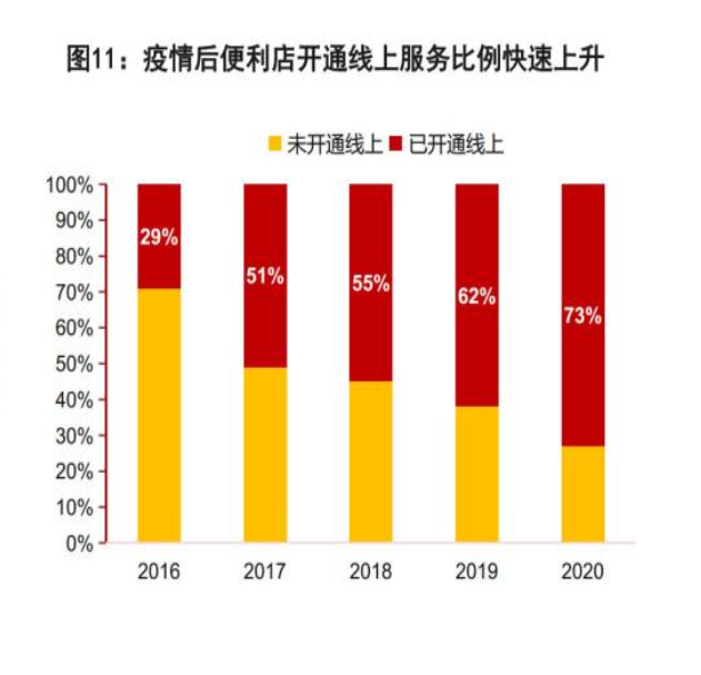 報(bào)告數(shù)據(jù)顯示,從2016年開始,線下便利店開始加速開通即時(shí)零售等線上服務(wù),開通線上占比從29%已提升至73%左右。