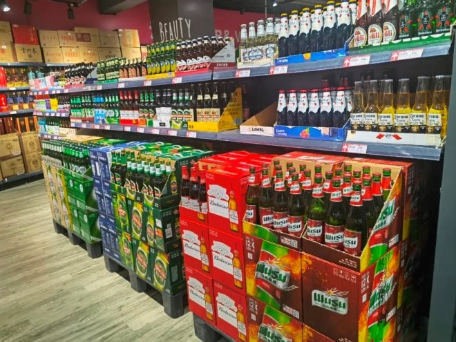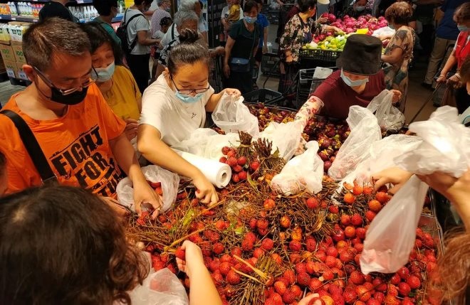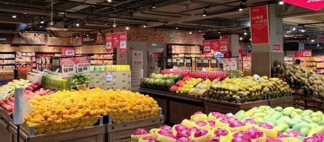 正在店內(nèi)可以看到,各類生鮮都有預(yù)包裝,不少水果、零食按箱售賣。