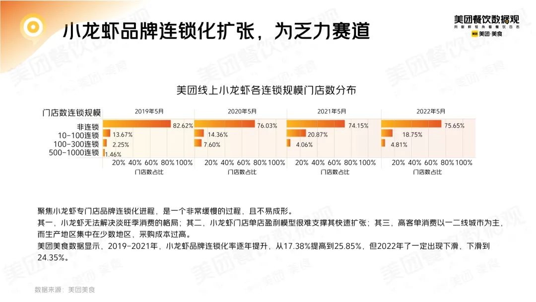 美團餐飲數(shù)據(jù)觀數(shù)據(jù)顯示,2019-2021年,小龍蝦品牌連鎖化率逐年提升,從17.38%提高到25.85%,但2022年出現(xiàn)了下滑,下滑到24.35%。
