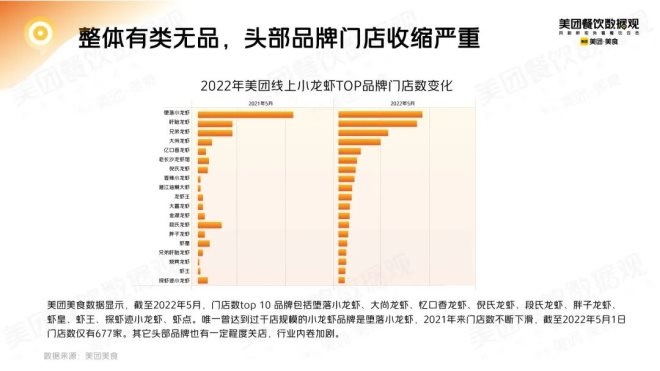 截至2022年5月,門店數(shù)top 10 品牌包括墮落小龍蝦、大尚龍蝦、憶口香龍蝦、倪氏龍蝦、段氏龍蝦、胖子龍蝦、蝦皇、蝦王、探蝦跡小龍蝦、蝦點。