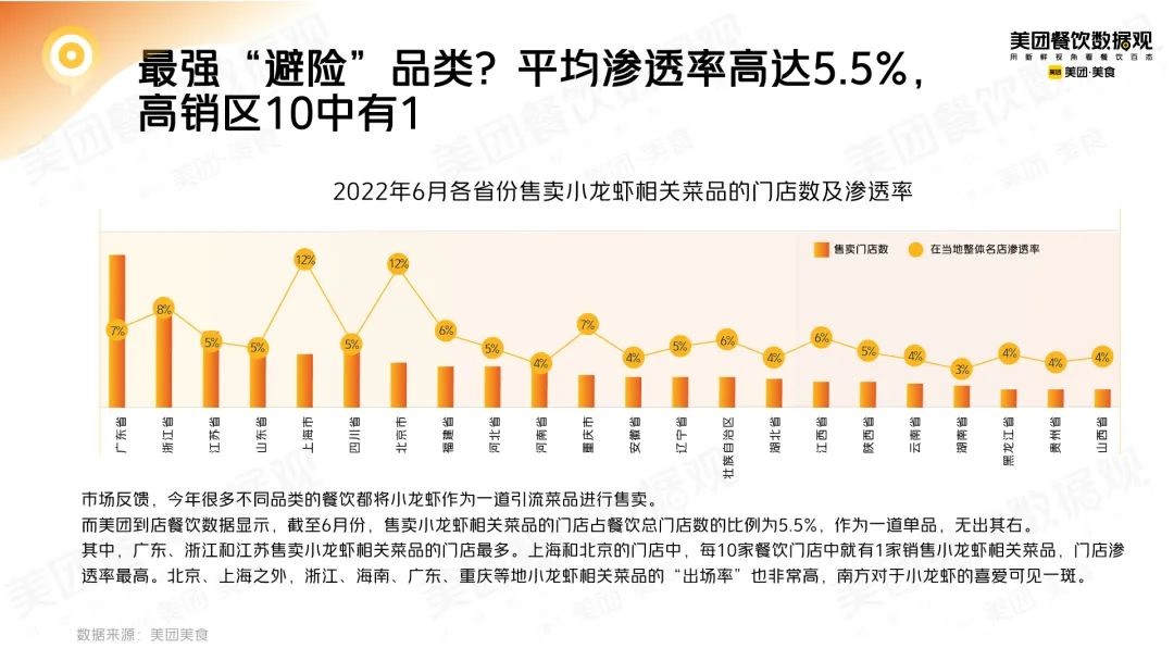 美團《2022小龍蝦品類發(fā)展報告》數(shù)據(jù)顯示,截至6月份,售賣小龍蝦相關菜品的門店占餐飲總門店數(shù)的比例為5.5%,作為一道單品,無出其右。
