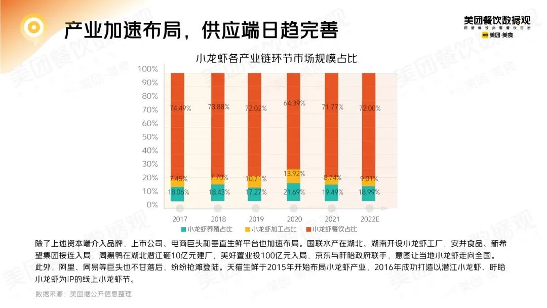 但更多產(chǎn)業(yè)資本正在布局,國聯(lián)水產(chǎn)在湖北、湖南開設小龍蝦工廠,安井食品、新希望集團接連入局,周黑鴨在湖北潛江砸10億元建廠,美好置業(yè)投100億元入局,京東與盱眙政府聯(lián)手,意圖讓當?shù)匦↓埼r走向全國。