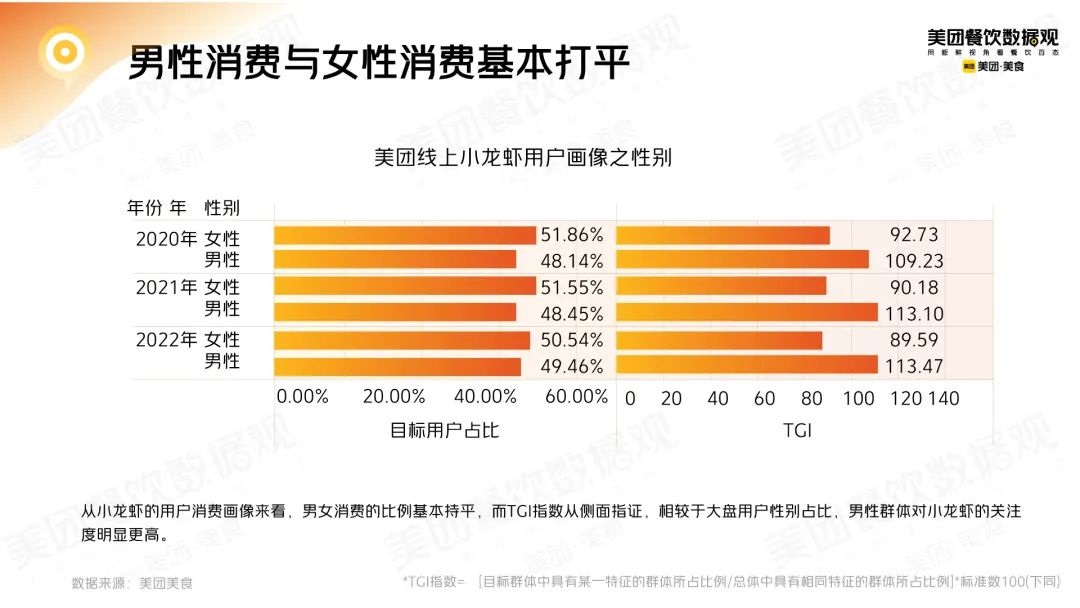 但從小龍蝦的用戶消費畫像看,男女消費的比例基本持平,TGI指數(shù)還從側(cè)面指證,相較于大盤用戶性別占比,男性群體對小龍蝦的關注度明顯更高。