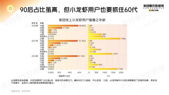 從消費年齡看,90后消費用戶占比超6成,是絕對的消費主力。橫向?qū)Ρ萒GI指數(shù),可以發(fā)現(xiàn),70后、60后同樣對小龍蝦消費釋放了足夠的熱情。