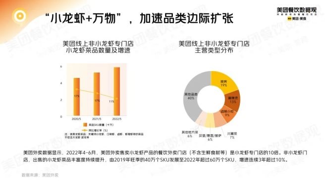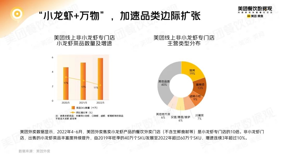 報告數(shù)據(jù)顯示,2022年4-6月,美團外賣售賣小龍蝦產(chǎn)品的餐飲外賣門店(不含生鮮食材等)是小龍蝦專門店的10倍。非小龍蝦門店,出售的小龍蝦菜品豐富度持續(xù)提升,由2019年旺季的40萬個SKU發(fā)展至2022年超過60萬個SKU,增速連續(xù)3年超過10%。