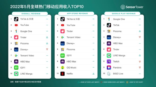 從收入來看,Sensor Tower調(diào)查報(bào)告顯示,2022年5月抖音及其海外版TikTok在全球App Store和Google Play吸金超過2.77億美元,是去年同期的1.6倍,蟬聯(lián)全球非游戲移動(dòng)應(yīng)用收入榜冠軍。其中,大約47.5%的收入來自中國(guó)版本抖音。