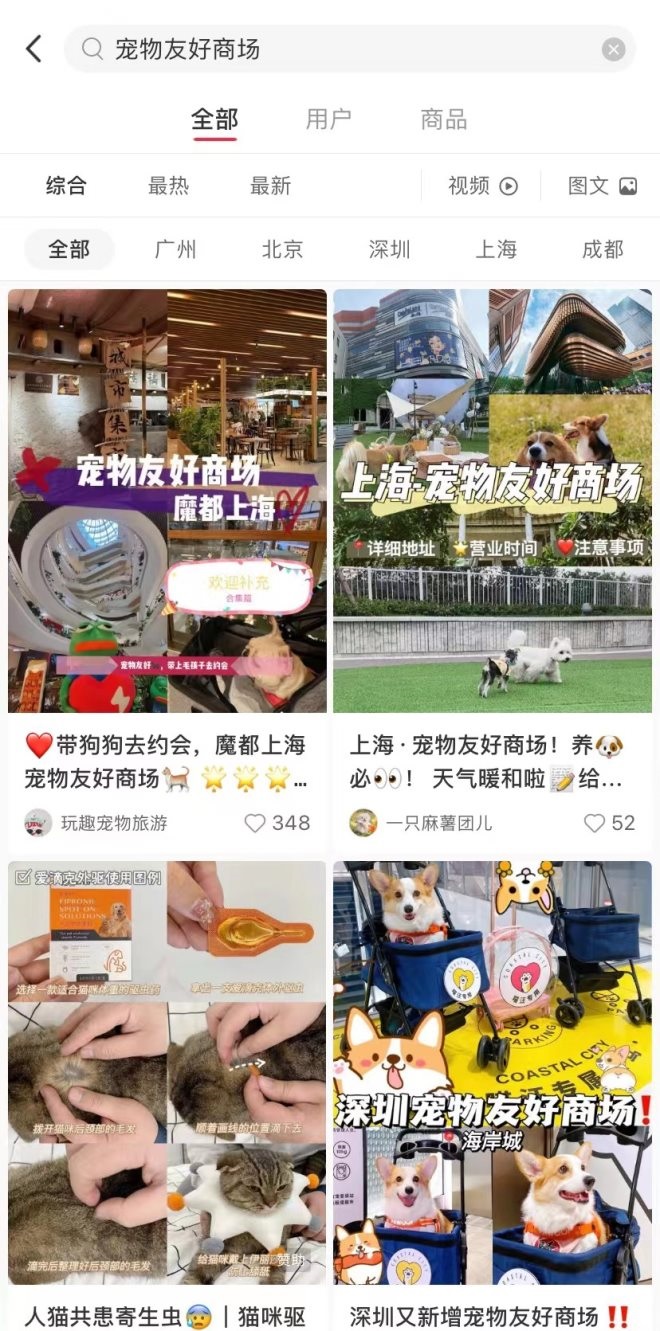 而作為寵物消費重要的場景之一,寵物商場的筆記也超過了2萬?梢钥吹,更多的人都在搜索每個城市都有哪些寵物友好商場的相關(guān)信息。