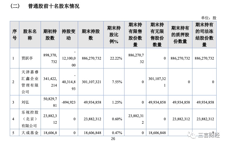 樂(lè)視網(wǎng)信息技術(shù)(北京)股份有限公司的大股東,依然是賈躍亭,持股比例62.41%。