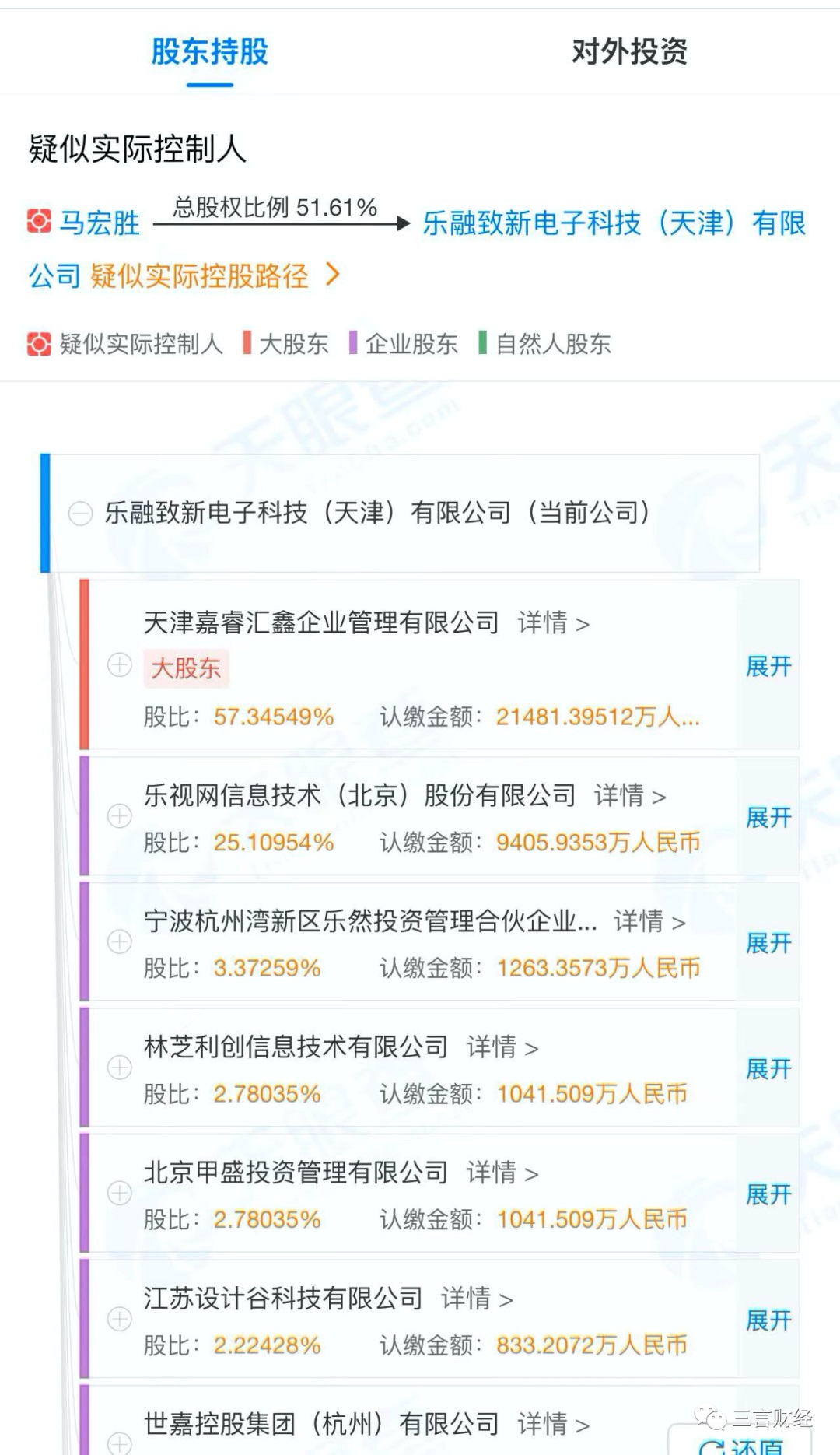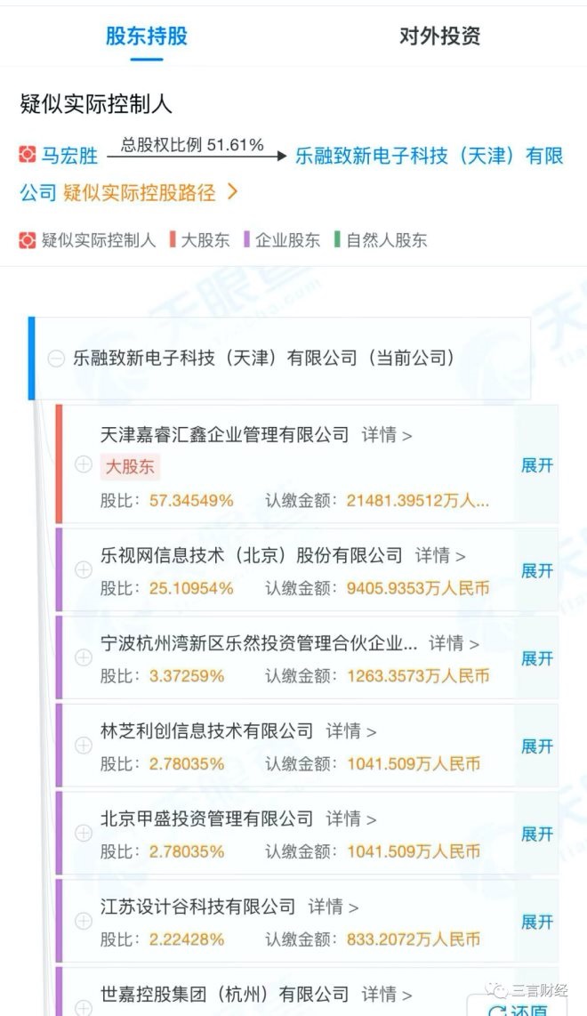 樂(lè)融致新電子科技(天津)有限公司的大股東為天津嘉睿匯鑫企業(yè)管理有限公,持股比例約為57.35%;樂(lè)視網(wǎng)信息技術(shù)(北京)股份有限公司是其第二大股東,持股比例約為25.11%。